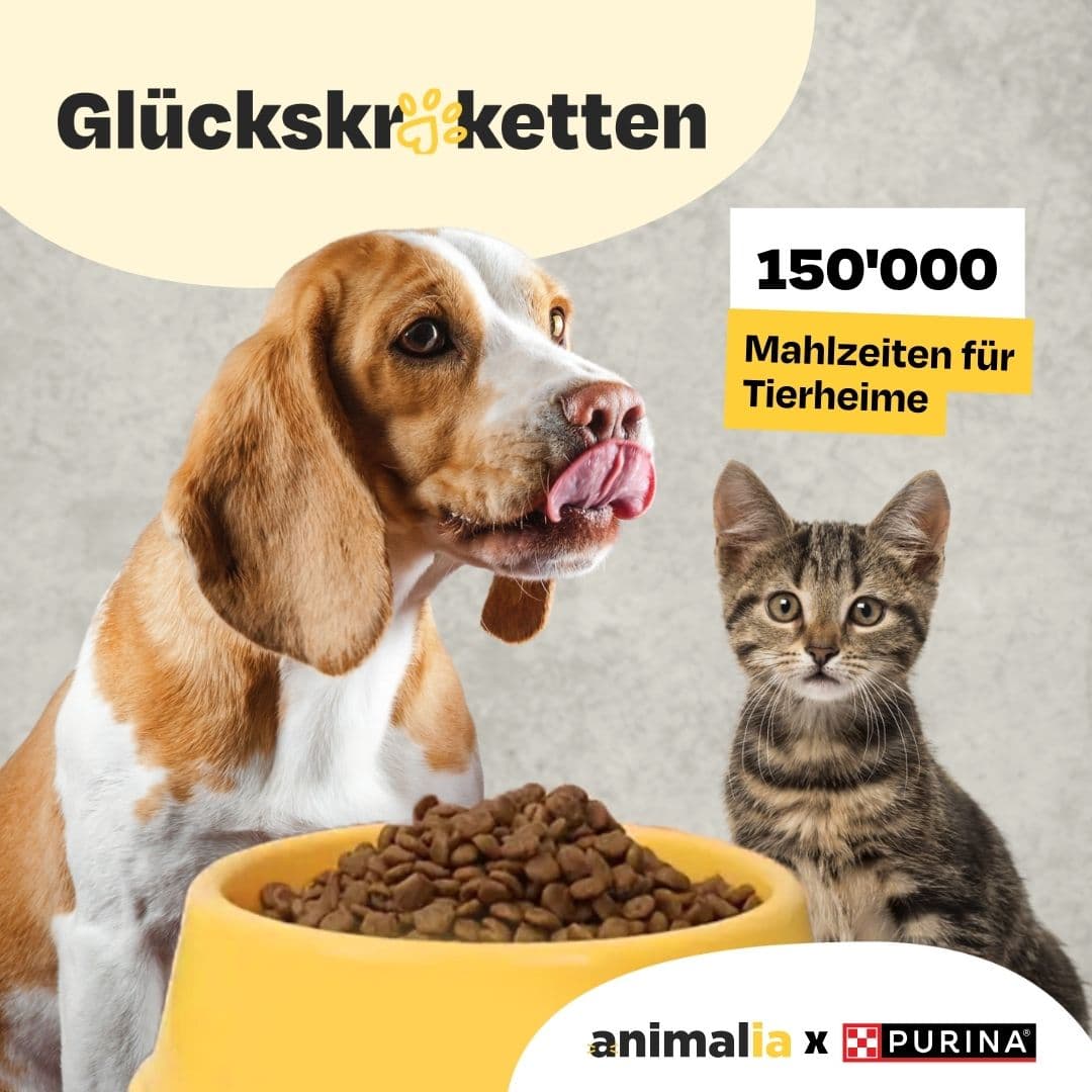 Purina unterstützt die Aktion «Glückskroketten» von Animalia und spendet das gesamte Futter (9 Tonnen) an die teilnehmenden Tierheime. Gesundheit beginnt bekanntlich bei der Ernährung. Deshalb war es uns wichtig, dass wir uns mit einem Partner mit denselben Werten zusammentun.